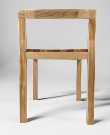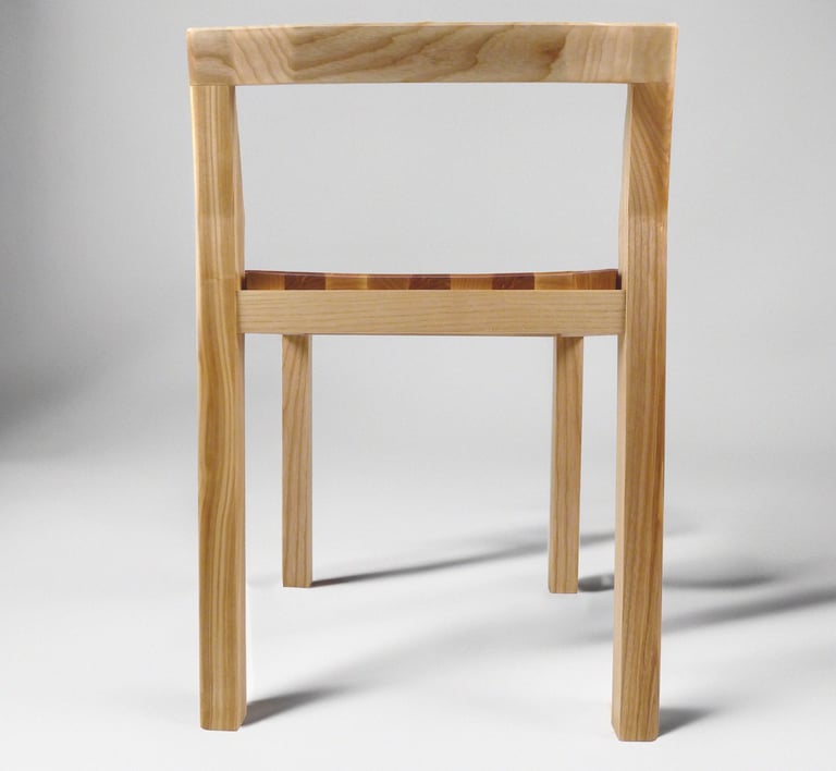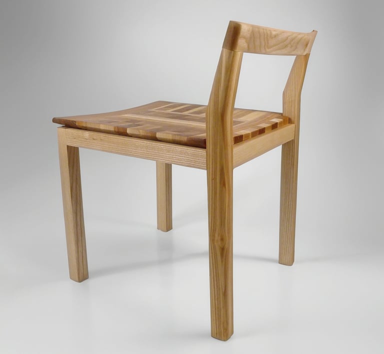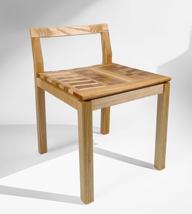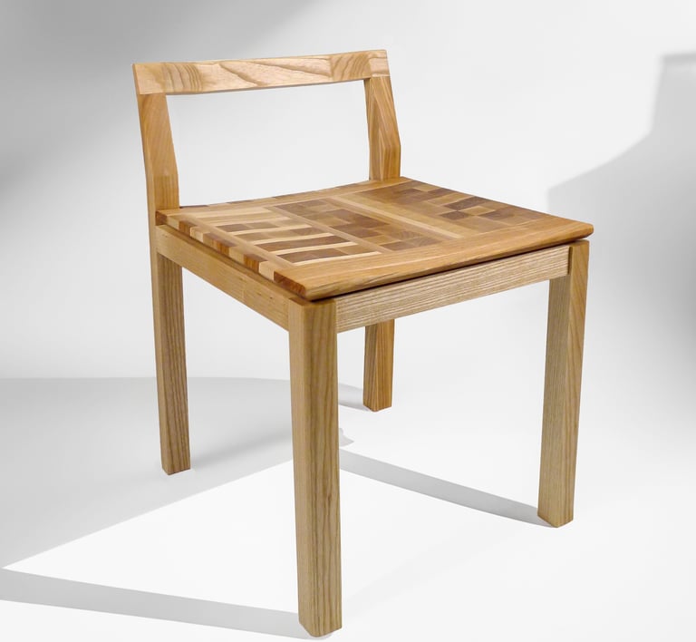 Une chaise au design japonais à l'assise en patchwork de bois.